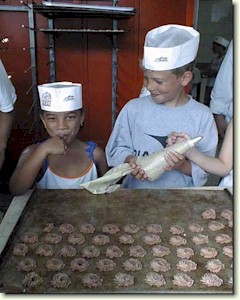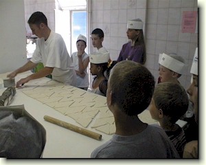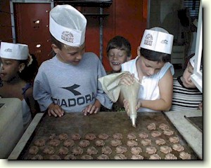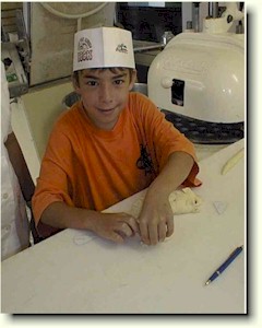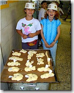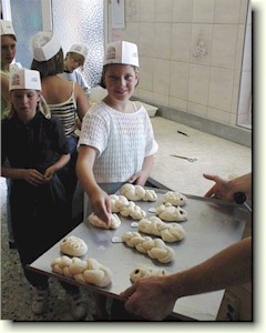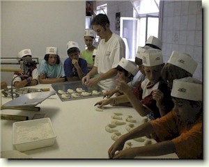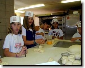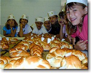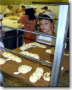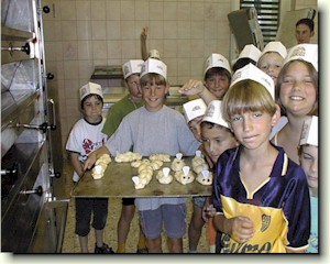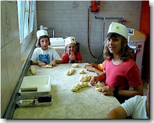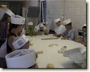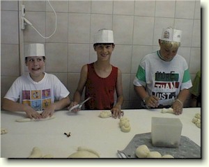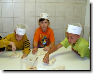 "Kinder waren bei uns zu Gast" Unter dem Titel "Ferien(s)pass" verbergen sich diverse Aktivitäten, die von den Reinacher Gemeinde für die daheimgebliebenen Kinder organisiert werden. Wie schon die letzten Jahre, stand auch diesmal der Besuch der Bäckerei Schulz auf dem Programm. Die zwei Stunden "schnuppern" beim Beck wurde für die aufgeschlossenen Schüler zu einem Plausch, bei dem sie erst noch ihren selbstgeflochtenen Zopf mit nach Hause nehmen durften. Als erstes konnte die muntere Kinderschar zuschauen, wie wir unsere vielen Gipfeli herstellen. Dabei wurden ihnen gleich die verschiedenen Maschinen der Backstube erklärt und man staunte nicht schlecht, denn alles war natürlich viel grösser und ganz anders als daheim in Muttis Küche. Nachdem sich alle Kinder die Hände gewaschen hatten, stellten wir zusammen einen Zopfteig her, aus dem sich alle zwanzig Mädchen und Buben einen eigenen Grittibänz und einen Zopf flechten konnten. Einige der Schüler stellten sich schon sehr geschickt an beim "Zöpfle", wobei andern das hantieren mit dem Teig sichtlich schwerer fiel. Aber es machte allen riesigen Spass, denn wer keinen Grittibänz mit nach Hause nehmen wollte, durfte sich sonst irgendein Fantasieprodukt kneten. Schlussendlich wurden sechs grosse Backbleche voll mit Zöpfchen, Igeln, Mäuschen, Schnecken, Grittis und sogar einem Dinosaurier und einer Klapperschlange in den heissen Ofen geschoben. Bei einem Glas Eistee standen wir den Kindern dann Red' und Antwort und man konnte uns bei unseren weiteren Arbeiten noch ein bisschen über die Schultern sehen. Es ist schon erstaunlich, mit wieviel Interesse uns die 8 - 14 jährigen beobachteten. Zu guter Letzt durften alle ihr selbstgemachtes Zöpfchen in Empfang nehmen und stolz ihren wartenden Eltern zeigen. Und wir waren uns einig, dass wir auch diesmal grossen Spass mit den Kindern hatten und ihnen ein spezielles Ferienerlebnis vermitteln konnten. Bilder Klicken Sie auf die Bildchen, um die Fotos in voller Grösse zu betrachten! Ferienspass 2001 Ferienspass 2000 Ferienspass 1999 Ferienspass 1998